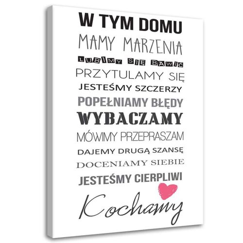 Odkryj wyjątkowy obraz na płótnie „W tym domu” o wymiarach 60x90 cm, który doda wyjątkowego charakteru każdemu wnętrzu! Ten niezwykle stylowy dodatek do Twojego domu wyróżnia się nowoczesnym designem i uniwersalnym przesłaniem, które sprawi, że każde pomieszczenie stanie się bardziej przytulne i wyjątkowe. Dzięki zastosowaniu innowacyjnej technologii druku UVgel FLXfinish, obraz zachwyca intensywnością kolorów oraz wytrzymałością, czyniąc go idealnym wyborem do każdego wnętrza.