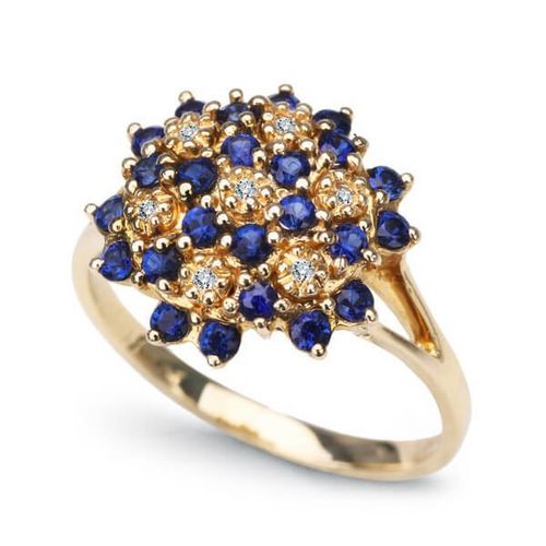 Oprócz diamentów, pierścionek zdobiony jest 24 szafirami o łącznej masie 0,80 ct., które dodatkowo podkreślają jego niepowtarzalny charakter. Szafiry symbolizują mądrość i lojalność, co czyni ten pierścionek doskonałym wyborem na zaręczyny lub jubileusz. Ich głęboki, niebieski kolor idealnie kontrastuje ze złotem, nadając całości wyrafinowanego i eleganckiego wykończenia.