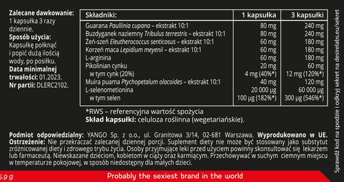 Składniki: Ekstrakt z guarany (Paullinia cupana) 10:1, ekstrakt z buzdyganka naziemnego (Tribulus terrestris) 10:1, ekstrakt z żeń-szenia (Eleutherococcus Senticosus) 10:1, ekstrakt z korzenia maca (Lepidium meyenii) 10:1, L-arginina, pikolinian cynku, ekstrakt z muira puama (Ptychopetalum olacoides) 10:1, L-selenometionina. Skład kapsułki: celuloza roślinna.
