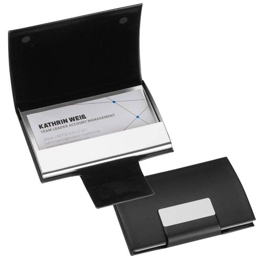 Etui na wizytówki wykonane z metalu i skóry ekologicznej z magnetycznym zapięciem.