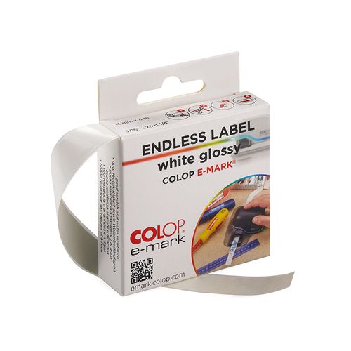 Nośnik ma szerokość 16 mm, podczas gdy rzeczywista etykieta ma szerokość 14 mm. Zapewnia to łatwe zdejmowanie i możliwość nadruku na całej powierzchni etykiety. Etykieta może być używana w połączeniu z prowadnicą do urządzenia COLOP E-mark lub linijką COLOP Emark dla precyzyjnego pozycjonowania nadruku.