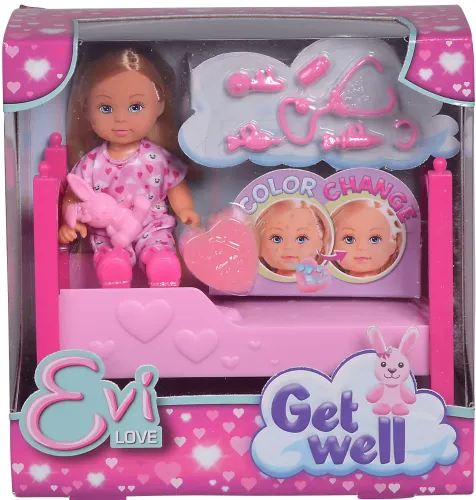 Laleczka Evi z wysypką na buzi, która znika po pocieraniu dołączoną gąbeczką, zachwyci wszystkie dziewczynki. Gąbkę należy zanurzyć w wodzie, działa pod wpływem zmiany temperatury. W zestawie znajduje się też łóżeczko, króliczek i akcesoria do badania lekarskiego. Wysokość laleczki: 12.0 cm