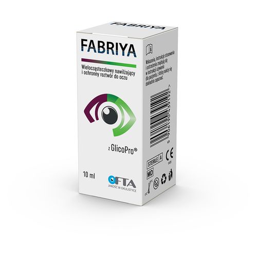 FABRIYA zawiera potrójną komponentę mucynową, wraz z komponentą mukoproteinową i białkową, o właściwościach smarujących, nawilżających, antyoksydacyjnych i ochronnych. które przynoszą korzyści w leczeniu zespołu suchego oka, a także w leczeniu wspomagającym podrażnień i stanów zapalnych spowodowanych warunkami środowiskowymi lub urazami mechanicznymi.