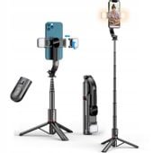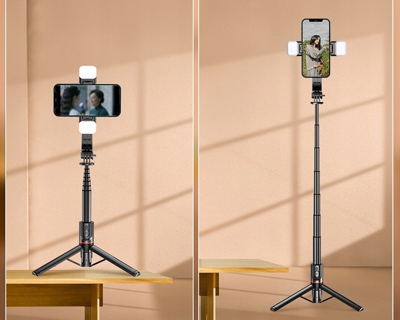 Bezprzewodowy selfie stick oraz wbudowany statyw (tripod) i lampa w jednym. Unikalne połączenie kijka ze statywem i lampami to nie zrównany komfort i wygoda. Ma wysuwaną rączkę i stojak , otwierany dolny statyw, może być używany jako statyw stacjonarny.