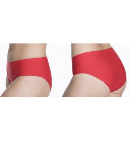 FIGI Simp czerwone typu bikini wykonane w technologii INVISIBLE-LINE (ultracienkie wykończenie brzegów). Figi bezuciskowe, cięte laserowo, wykonane w technologii bezszwowej. Figi w górnej części wykończone delikatną koronką. Kolor czerwony.