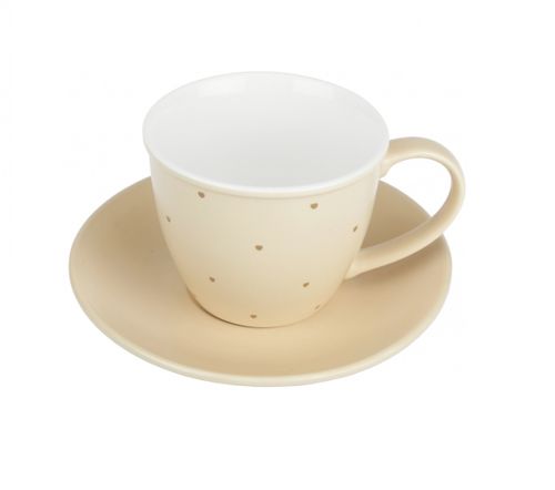 Filiżanka ze spodkiem COFFEA 220 ml to doskonały wybór dla wszystkich miłośników aromatycznej kawy oraz lekkich herbat. Wykonana z wysokiej jakości porcelany New Bone, ten elegancki zestaw nie tylko zachwyca swoim wyglądem, ale również trwałością. Jej piękny kremowy kolor z delikatnym wzorem malutkich serduszek sprawi, że każda chwila spędzona podczas picia napoju będzie jeszcze bardziej wyjątkowa.