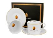 Klasyczne białe filiżanki zdobione jedynie niebanalnym ziarenkiem kawy w złotym kolorze oraz prostym napisem. Prostota ksztaltu i designu znajdzie miejsce w każdym wnętrzu.