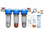 Ten zaawansowany filtr trzystopniowy wstępny do wody, model 10" z przyłączem 3/4 cala, wyróżnia się solidną konstrukcją na płytce montażowej, z trzema wkładami (sznurkowym, zmiękczającym i węglowym) oraz dwoma mosiężnymi kurkami kulowymi. Zapewnia wieloetapową filtrację, skutecznie usuwając zanieczyszczenia mechaniczne, osady i nieprzyjemne zapachy, co gwarantuje krystalicznie czystą wodę prosto z kranu.