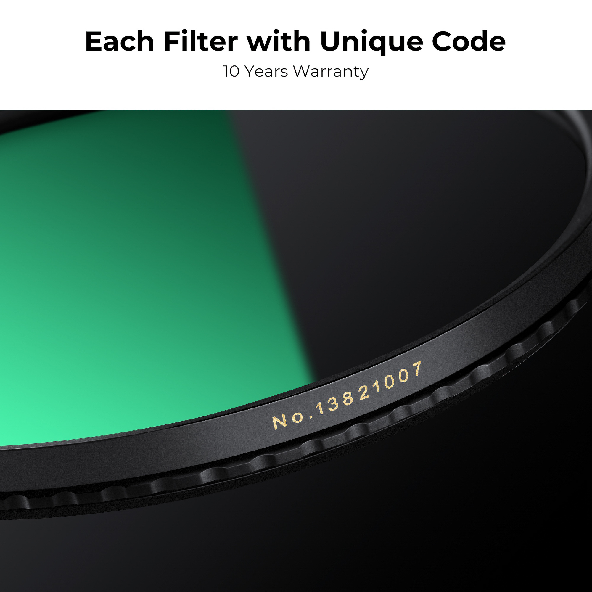 Każdy filtr polaryzacyjny K&F Concept Nano-X Pro posiada swój unikalny kod identyfikacyjny, zapewniający jego autentyczność i umożliwiający szybką identyfikację produktu. Znajdziesz go na mosiężnej ramce. To właśnie ten numer pozwoli Ci skorzystać z 10-letniej gwarancji. W przypadku jakichkolwiek problemów możesz zawsze liczyć na wsparcie producenta. Wystarczy, że podasz unikalny kod produktu, aby skorzystać z naprawy lub wymienić produkt.