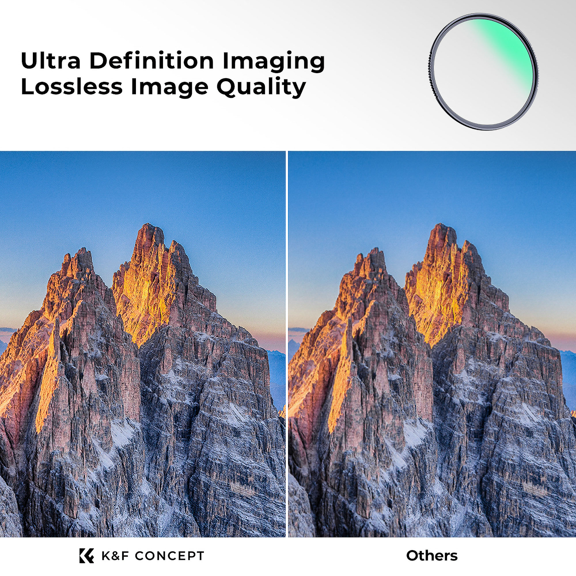 Promieniowanie UV, obecne w otoczeniu nawet w pozornie idealnych warunkach pogodowych, może powodować niepożądane efekty, takie jak zamglenia, spadek kontrastu lub nieostrość zdjęć. Filtr UV K&F Concept Nano-X MRC UV działa jak niewidzialna bariera, przez którą przepuszczane jest światło. Eliminuje wpływ promieniu UV na Twoje zdjęcia, pozytywnie oddziałując na klarowność obrazu.