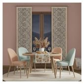 Panelowa firanka upiększona jest eleganckim, klasycznym motywem zdobniczym.