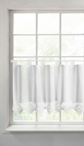 Zazdrostka zdobiona koronką nadaje kuchni delikatny charakter rustykalny. Zazdrostka posiada szelki, dzięki czemu bez problemu można ją zawiesić na pręcie/ minikarniszu do zazdrostek.