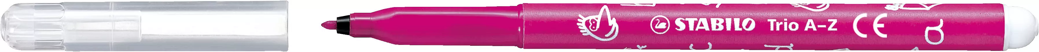STABILO Trio A-Z to flamastry z ergonomicznym, trójkątnym uchwytem oraz mocną, odporną na złamanie końcówką. Flamastry posiadają wentylowaną skuwkę oraz łatwo zmywalny tusz, który bez problemu można usunąć z dłoni oraz ubrań. Grubość linii 0,7 mm. Kartonowe etui zawiera 24 sztuki.