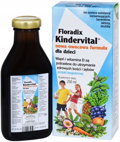 Floradix Kindervital to suplement diety przeznaczony specjalnie dla dzieci, dostarczający kluczowe składniki odżywcze. Kompozycja koncentratów soków owocowych i ziołowych wyciągów wodnych zapewnia bogactwo witamin i minerałów, koniecznych do prawidłowego wzrostu i rozwoju młodego organizmu.