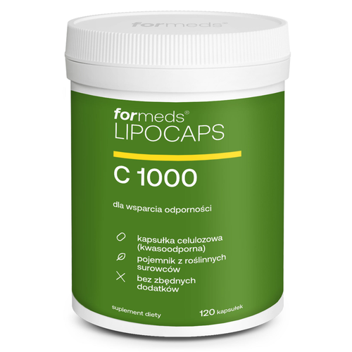 Suplement diety ForMeds LIPO CAPS C 1000 to produkt dostarczający stabilnej witaminy C. Kwasoodporna kapsułka zapewnia odporność liposomalnej formy witaminy na działanie kwasu solnego w żołądku i umożliwia uwolnienie substancji czynnej w jelicie. Jedna porcja produktu zawiera aż 1000 mg tej witaminy. Jest ona niezbędna do prawidłowego funkcjonowania całego organizmu.