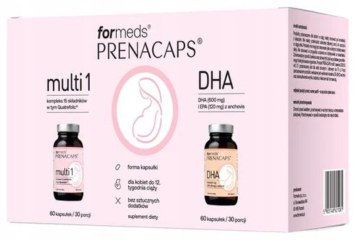 PRENACAPS multi 1 + DHA to suplement diety stworzony specjalnie dla kobiet w ciąży, oferujący kompleksową pomoc w tym wyjątkowym okresie. Dzięki starannie dobranym składnikom, takim jak kwas foliowy, witamina D3, jod i kwasy DHA, produkt ten zapewnia optymalne wsparcie dla prawidłowego rozwoju płodu i dobrego samopoczucia przyszłej mamy.