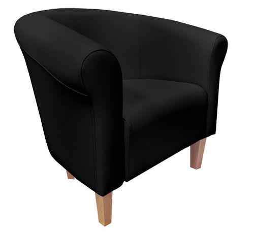 Miękki fotel wypoczynkowy wykonany z eco skóry wyposażony w drewniane bukowe nóżki w kolorze naturalnego drewna.