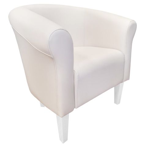 Miękki fotel wypoczynkowy wykonany z eco skóry wyposażony w drewniane bukowe nóżki w kolorze białym.