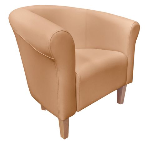 Miękki fotel wypoczynkowy wykonany z eco skóry wyposażony w drewniane bukowe nóżki w kolorze naturalnego drewna.