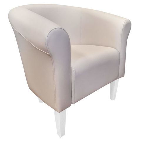 Miękki fotel wypoczynkowy wykonany z eco skóry wyposażony w drewniane bukowe nóżki w kolorze białym.