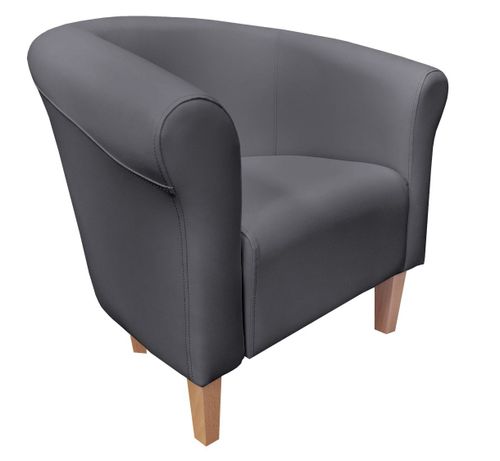 Miękki fotel wypoczynkowy wykonany z eco skóry wyposażony w drewniane bukowe nóżki w kolorze naturalnego drewna.