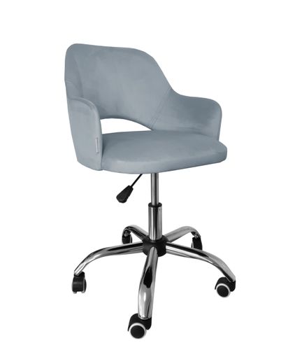 Nowoczesny i wygodny fotel obrotowy, tapicerowany miękką tkaniną na chromowanej podstawie.