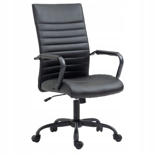 Fotel biurowy idealnie dopasowujący się do sylwetki siedzącego, obity miękką eko skórą. Wyprofilowany tak, aby zapewnić maksymalną wygodę, nawet przy wielogodzinnym siedzeniu. Wysoki, wbudowany zagłówek i odpowiednie wyprofilowanie gwarantuje funkcjonalność i oparcie dla głowy, a szerokie siedzisko pozwoli na wielogodzinną pracę. Podłokietniki są odpowiednio ukształtowane, co podnosi wygodę użytkowania, a także obciążenie kręgosłupa. 5 - ramienna podstawa - krzyżak z podwójnymi kółkami łatwo się obraca i zapewnia stabilne przemieszczanie.