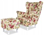 Fotel, którego dotyczy aukcja, wykonany został w tkaninie ROSE 01. Róże w kilku barwach: herbacianej, jasnoróżowej i czerwonej na jasnym kremowy tle.. Dzięki niejednolitej grafice ewentualne zabrudzenia są mniej widoczne.