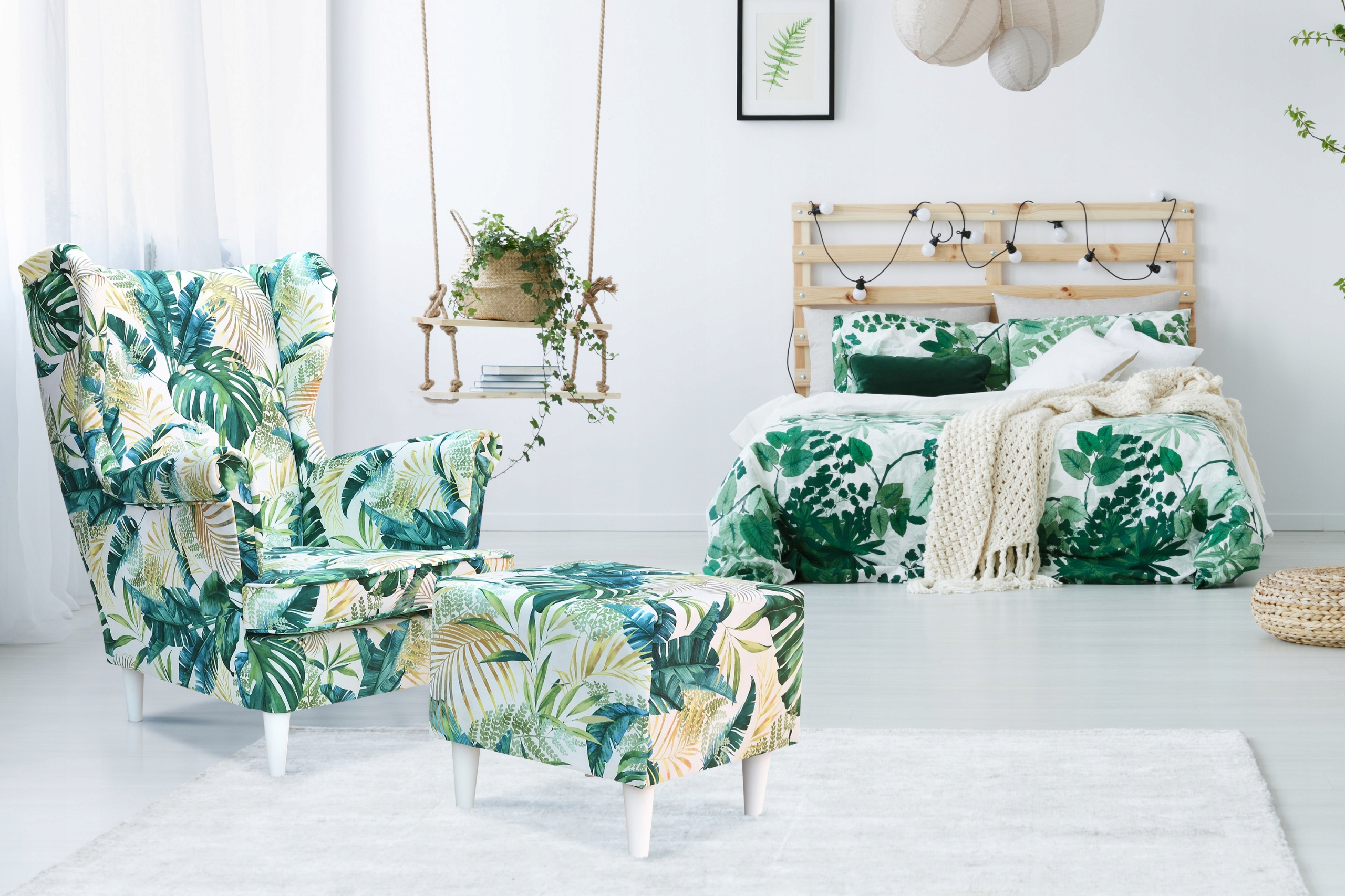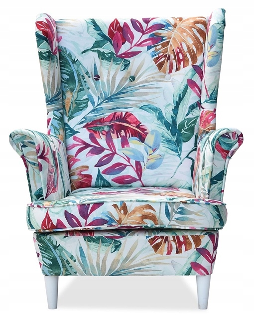 Fotel, którego dotyczy aukcja, wykonany został w tkaninie M 131. Różowe, pomarańczowe, zielone liście na jasnym tle. Dzięki niejednolitej grafice ewentualne zabrudzenia są mniej widoczne.