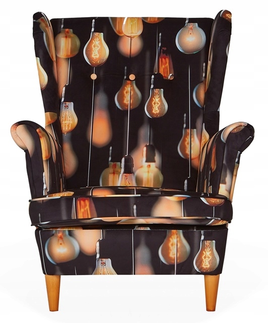 Fotel, którego dotyczy aukcja, wykonany został w tkaninie M 131. Przedstawia ona żarówki na ciemnym tle. Dzięki niejednolitej grafice ewentualne zabrudzenia są mniej widoczne.