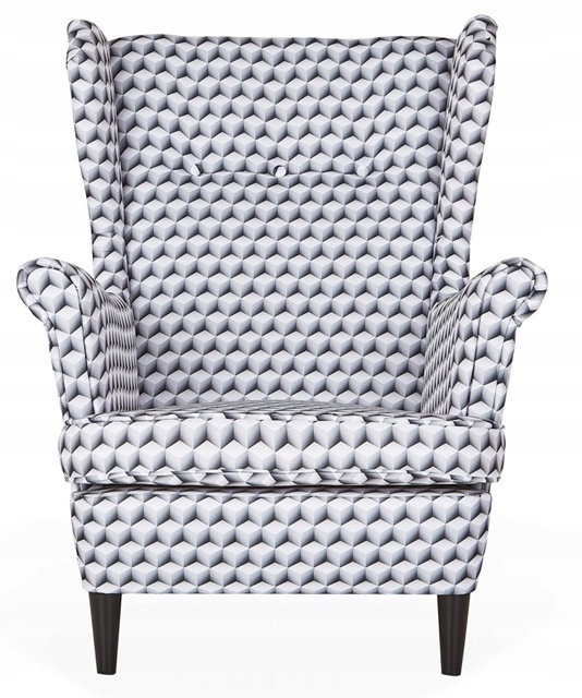 Fotel, którego dotyczy aukcja, wykonany został w tkaninie M 54. Wzór 3D w odcieniach szarości. Dzięki niejednolitej grafice ewentualne zabrudzenia są mniej widoczne.
