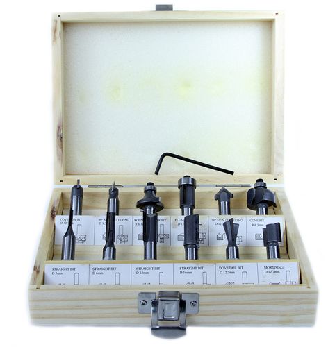 zestaw ten jest oferowany w praktycznym, wykonanym z twardego drewna pudełku. Frezy wysokiej jakości ze stali węglowej z ostrzami wykonanymi