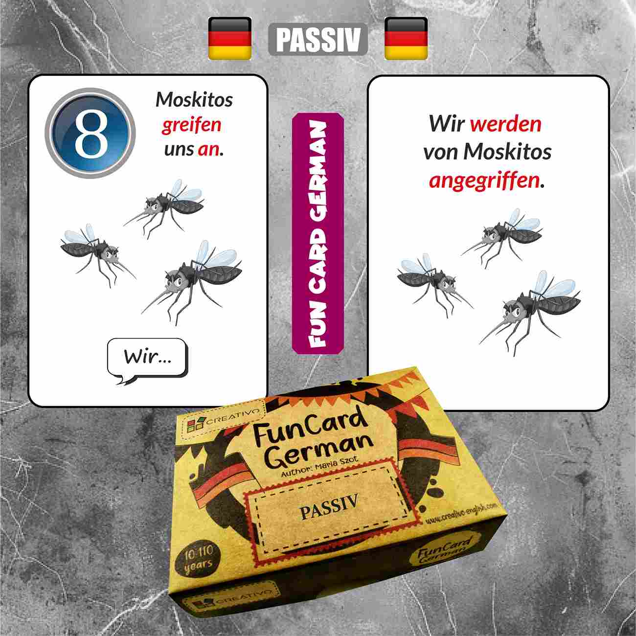 „Fun Card German. Passiv” to zestaw 50 kart do nauki strony biernej w języku niemieckim, idealny dla uczniów na poziomie podstawowym i średnio zaawansowanym. Karty mogą być używane jako fiszki do nauki indywidualnej lub jako ekscytująca gra na zajęciach języka niemieckiego! Karty zawierają zadania polegające na przekształcaniu zdań aktywnych na bierne, wspomagane ilustracjami, które pomagają zrozumieć kontekst zdań. Na odwrocie każdej karty znajdują się poprawne odpowiedzi, co ułatwia samodzielne sprawdzanie postępów w nauce Karty mogą być używane jako fiszki lub ekscytująca gra, w której celem jest jak najszybsze pozbycie się kart. Karty „Fun Card German” gwarantują szybkie postępy oraz doskonałą zabawę. Zakup produktów CREATIVO to inwestycja na lata. Karty wykonane są z najwyższej jakości kartonu i zapakowane w solidne pudełka, co zapewnia ich trwałość.