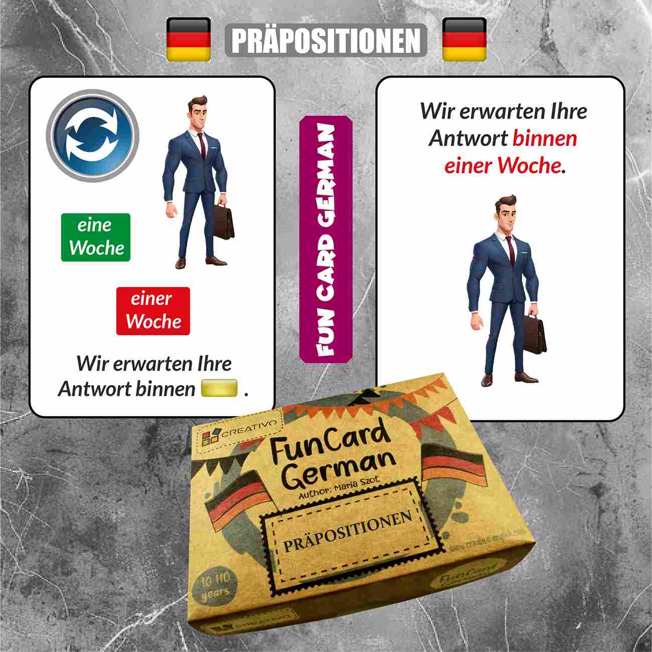 „Fun Card German. Präpositionen” to zestaw 50 kart, który pomaga w nauce poprawnego użycia przyimków w języku niemieckim. Karty mogą być używane jako fiszki do nauki indywidualnej lub jako ekscytująca gra na zajęciach języka niemieckiego! Karty zawierają zadania do uzupełnienia odpowiednimi przyimkami, które są wspierane ilustracjami ułatwiającymi zrozumienie kontekstu. Na odwrocie kart znajdują się poprawne odpowiedzi, co umożliwia samodzielne sprawdzanie postępów. Karty mogą być używane jako fiszki lub ekscytująca gra, w której celem jest jak najszybsze pozbycie się kart. Karty „Fun Card German” gwarantują szybkie postępy oraz doskonałą zabawę. Zakup produktów CREATIVO to inwestycja na lata. Karty wykonane są z najwyższej jakości kartonu i zapakowane w solidne pudełka, co zapewnia ich trwałość.