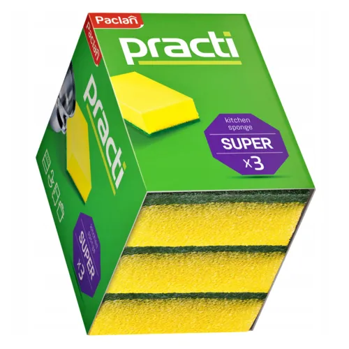 Paclan Practi to gąbki do naczyń stworzone z myślą o codziennej wygodzie i efektywności. Dzięki swojej miękkiej strukturze idealnie nadają się do czyszczenia naczyń, delikatnej zastawy, garnków i patelni, pozostawiając je lśniąco czystymi i wolnymi od zarysowań.