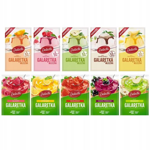 Ta wyjątkowa galaretka Delecta oferuje aż 10 różnorodnych smaków w jednym opakowaniu - od klasycznych owocowych po delikatne mleczne. Każdy smak został starannie opracowany z użyciem naturalnych ekstraktów i koncentratów owocowych, takich jak sok z cytryny, koncentrat czarnej porzeczki czy proszek truskawkowy, zapewniając autentyczny i intensywny smak każdego deseru.