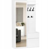 Ten wysokiej jakości zestaw garderobowy do przedpokoju model V-5 w kolorze białym wyróżnia się nie tylko eleganckim i trwałym designem, ale także przemyślaną konstrukcją. Składa się z szafy z lustrem, wieszaka z półką oraz szafki z drzwiami i szufladą, co zapewnia optymalne wykorzystanie przestrzeni i niezawodne przechowywanie ubrań oraz obuwia na co dzień.