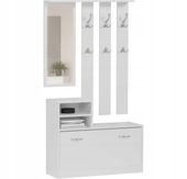 Ten wysokiej jakości zestaw garderobowy model V-1 w kolorze białym wyróżnia się nie tylko eleganckim i praktycznym designem, ale także wyjątkową funkcjonalnością. Składa się z szafki na obuwie z wygodnymi półkami, które umożliwiają łatwe przechowywanie butów, oraz wieszaka z lustrem wyposażonego w sześć haczyków na odzież – trzy duże i trzy małe – zapewniając idealną organizację w przedpokoju.