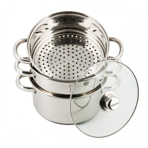 Komplet garnków do gotowania na parze wykonany jest z wysokiej jakości stali nierdzewnej. Wykorzystana stal składa się z najlepszej jakości stopu powszechnie stosowanego w światowej klasy produktach, co gwarantuje jej wysoką odporność na korozję oraz bardzo dobrą wytrzymałość. Zastosowany materiał umożliwia szybkie podgrzanie potraw i przez dłuższy czas utrzymuje ciepło. Produkt przystosowany do gotowania na kuchenkach indukcyjnych, gazowych, elektrycznych, ceramicznych i halogenowych. Można go bezpiecznie myć w zmywarkach.