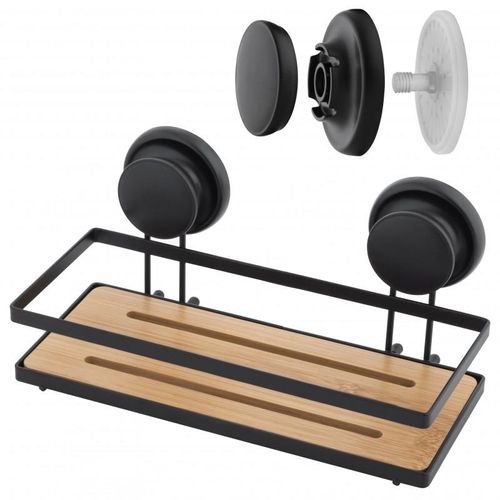 Koszyk łazienkowy wykonany z wysokiej jakości stali. Elementy dekoracyjne z drewna bambusowego. Półka mocowana do ściany na dwie silne przyssawki.