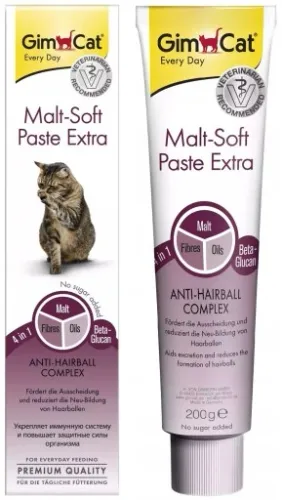 Wysokiej jakości pasta odkłaczająca GimCat Malt-Soft Ekstra nie tylko ułatwia pozbycie się połkniętej sierści, ale również dostarcza kotu energii, dzięki zawartości naturalnego słodu oraz wartościowych olejów.