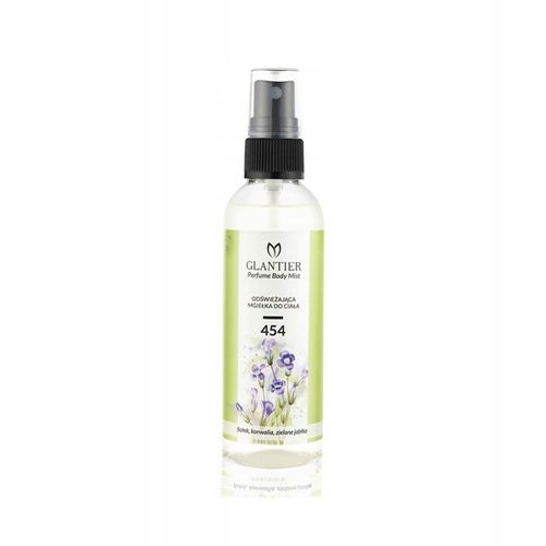 Odświeżająca mgiełka do ciała o zmysłowym, kwiatowo-owocowym zapachu Perfum Glantier 454, który stanowi rześką jak wiosenny poranek kompozycję, urzekającą pięknem i spokojem kwitnących roślin. Zapachowa mgiełka do ciała to lżejsza formuła perfum i wody perfumowanej Glantier.