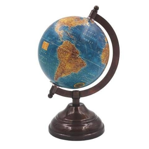 Piękne, żywe kolory globusa - morza i oceany błękit, lądy - odcienie złoci i brązu.
