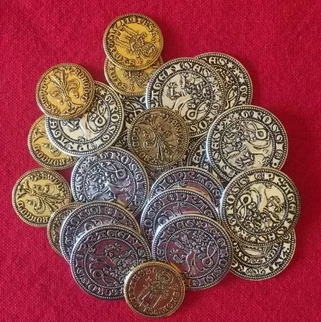Zestaw 24 metalowych monet przypominających grosze praskie i floreny. 16 sztuk o średnicy 2.8 cm oraz 8 sztuk o średnicy 2.1 cm. Jako świeżo pasowany rycerz zdobądź najlepszą zbroję, silnego wierzchowca oraz sojuszników, którzy pomogą ci zwyciężać w szrankach. Stań do turnieju i walcz ze znamienitymi rywalami czekającymi na Twe wyzwanie. Dołącz do elity, która sięgnie po sławę i chwałę! Zwyciężaj dzięki dobremu przygotowaniu i sprytnym manewrom taktycznym! Czy minstrele ułożą pieśni o Twej waleczności? Czy zyskasz powszechny szacunek za swój honor lub pobożność? Czy Twe imię zapisze się w pamięci potomnych jak Zawiszy Czarnego lub Ulricha von Lichtensteina? Stań do walki i znajdź swoją drogę do chwały!