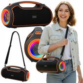 Ten głośnik wyróżnia się wszechstronnością dzięki wejściom Bluetooth, AUX, USB, TF (microSD) oraz dedykowanemu wejściu mikrofonowemu z efektem echa, idealnemu do karaoke. Funkcja TWS pozwala sparować dwa urządzenia dla pełnego brzmienia stereo, a podświetlenie LED reagujące na rytm dodaje wizualnej energii, tworząc immersyjną atmosferę na imprezach czy spotkaniach.