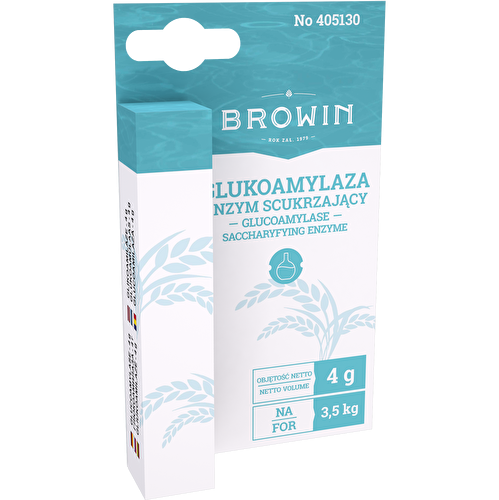 Sposób użycia: W naczyniu podgrzej wodę do temperatury 85-95°C, dodaj śrutę wybranego zboża w proporcji: 1 kg śruty na 3-4 L wody. Dokładnie wymieszaj, a po 15-30 minutach dodaj alfa-amylazę (405120) w ilości 0,9 g na 1 kg śruty, w celu upłynnienia skrobi.