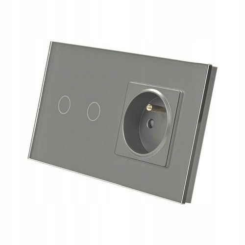 Włącznik światła dotykowy podwójny z gniazdem 230V, na dwie puszki montażowe, z panelem szklanym w kolorze szarym i podświetleniem LED