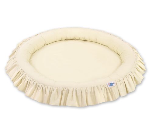 Oryginalne gniazdko z falbanką. Funkcjonalne i praktyczne. Doskonale sprawdzi się jako mini basenik, mata do zabawy lub "podłoga" baldachimu. Szerokie, okrągłe i mięciutkie ścianki zapewnią bezpieczną i udaną zabawę dla każdego malucha. Gniazdko może być używane już od pierwszych dni życia jako wygodny i bezpieczny kokon niemowlęcy a później jako przytulne miejsce do zabawy. Pokrowiec wykonany jest z tkaniny 100% bawełnianej, posiadającej atest Okotex. Boki gniazdka wypełnione są atestowanym włóknem Eco Fillball – mięciutkim włóknem uformowanym w malutkie kuleczki. Dzięki specjalnej technologii produkcji kuleczki te są puszyste i sprężyste, a przy tym w dotyku są miękkie i delikatne jak puch, zapewniają odpowiednią cyrkulację powietrza. Dno gniazdka, to specjalna wkładka wykonana z nowoczesnego antyalergicznego atestowanego surowca. Gniazdko łatwo utrzymać w czystości, pokrowiec jest rozbieralny - można prać w pralce w 30 stopniach.