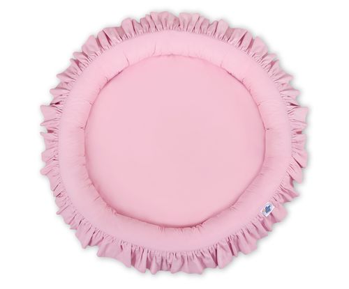 Oryginalne gniazdko z falbanką. Funkcjonalne i praktyczne. Doskonale sprawdzi się jako mini basenik, mata do zabawy lub "podłoga" baldachimu. Szerokie, okrągłe i mięciutkie ścianki zapewnią bezpieczną i udaną zabawę dla każdego malucha. Gniazdko może być używane już od pierwszych dni życia jako wygodny i bezpieczny kokon niemowlęcy a później jako przytulne miejsce do zabawy. Pokrowiec wykonany jest z tkaniny 100% bawełnianej, posiadającej atest Okotex. Boki gniazdka wypełnione są atestowanym włóknem Eco Fillball – mięciutkim włóknem uformowanym w malutkie kuleczki. Dzięki specjalnej technologii produkcji kuleczki te są puszyste i sprężyste, a przy tym w dotyku są miękkie i delikatne jak puch, zapewniają odpowiednią cyrkulację powietrza. Dno gniazdka, to specjalna wkładka wykonana z nowoczesnego antyalergicznego atestowanego surowca. Gniazdko łatwo utrzymać w czystości, pokrowiec jest rozbieralny - można prać w pralce w 30 stopniach.
