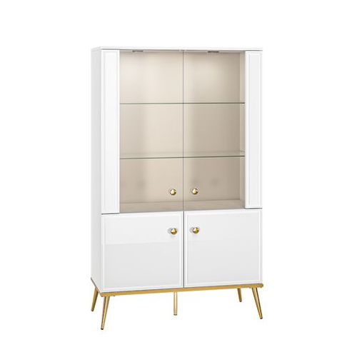 Luksusowe meble, pełne elegancji oraz połysku rozjaśnią wnętrze nowoczesnego salonu jak i sypialni. Skośne stożkowe nóżki w kolorze błyszczącego złota, idealnie komponują się z wieńcem dolnym wykończonym w tym samym odcieniu złota. Delikatne zdobienia na drzwiczkach oraz złote uchwyty stanowią dopełnienie tej pełnej kunsztu oraz szyku kolekcji.